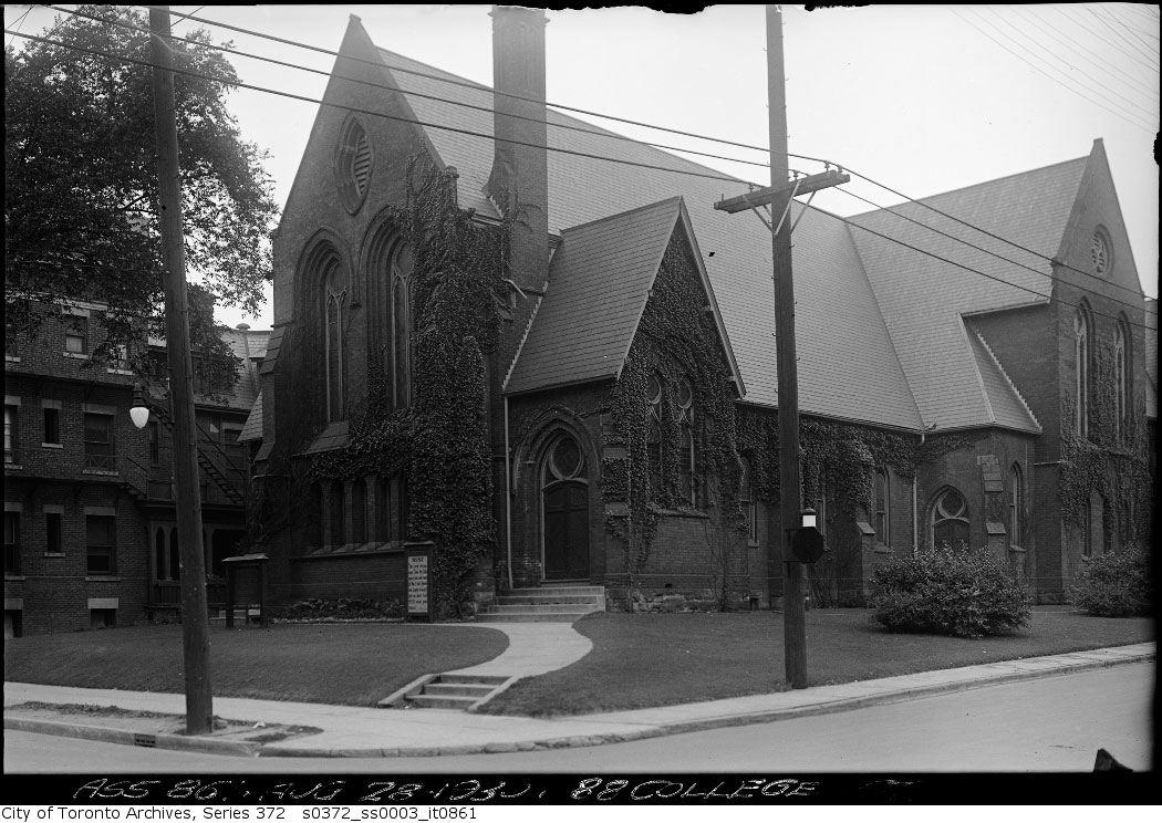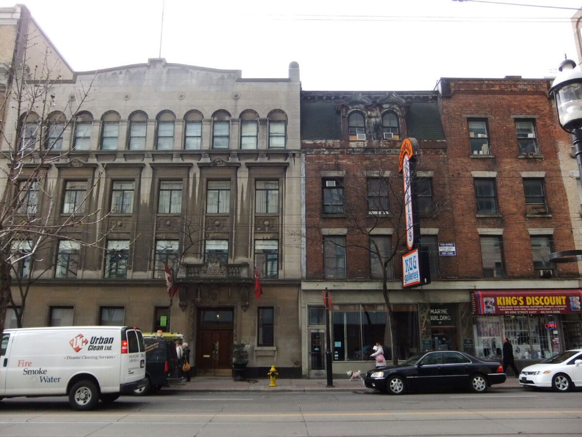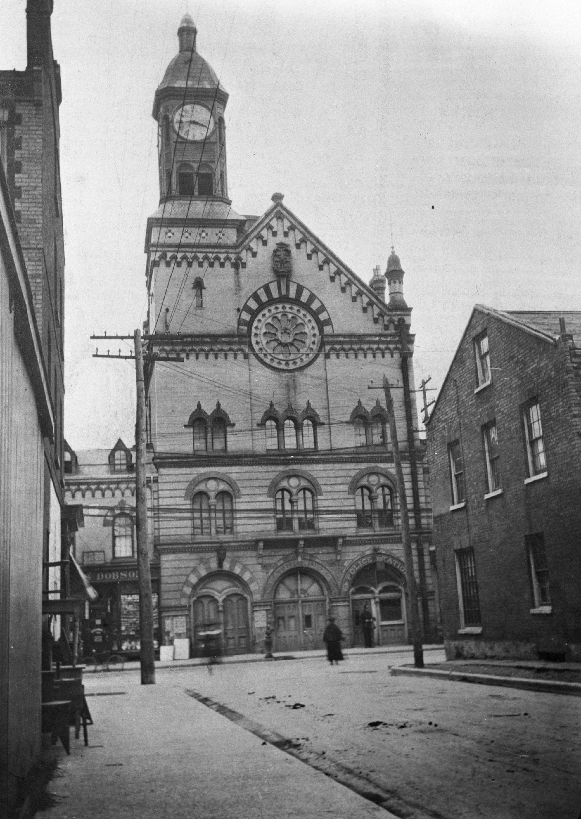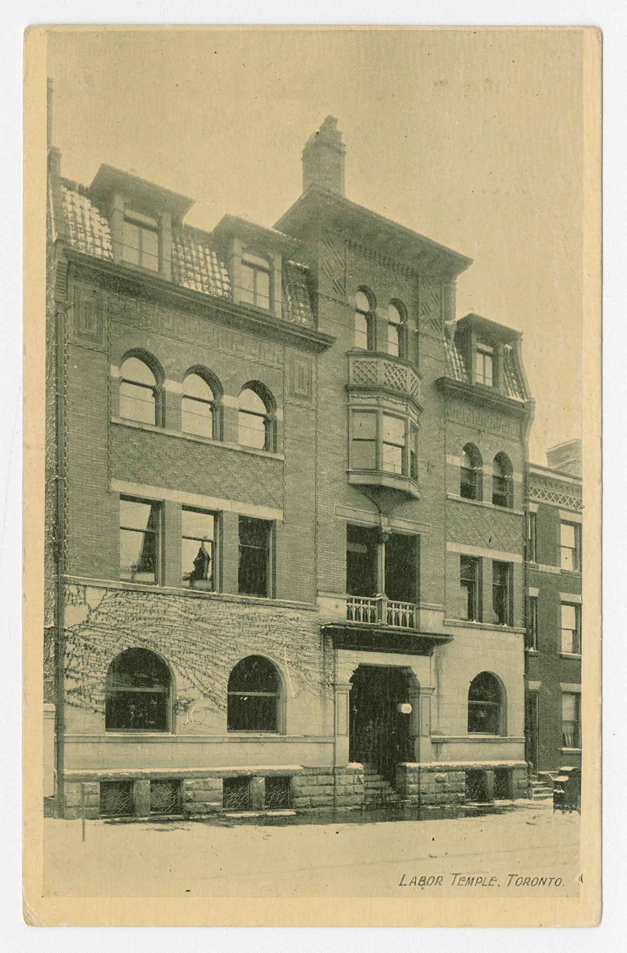 This building was originally constructed for the Athenaeum Club of Toronto in 1891. The private club was short-lived however, and in 1904, the building became the Labour Temple. It hosted union offices, and played a key role in Canadian labour movement history. In 2006, the building was demolished, except for the facade, which is incorporated into the Jazz Apartments building.