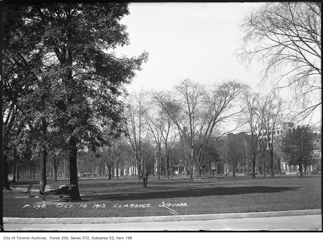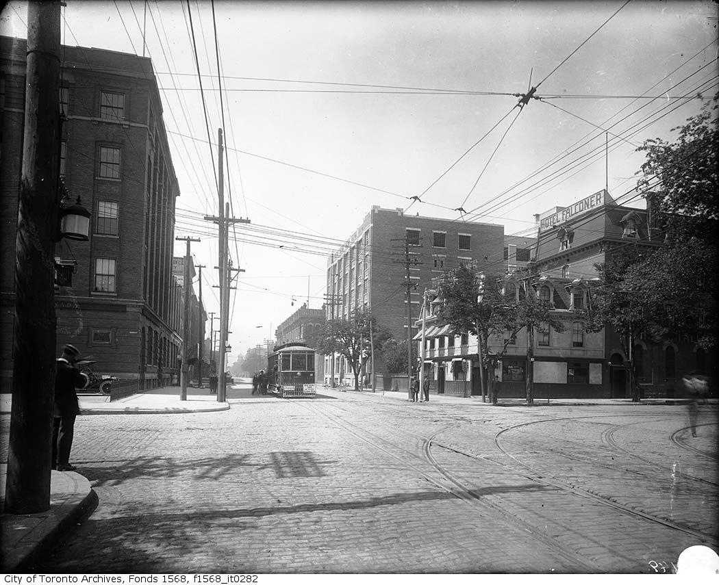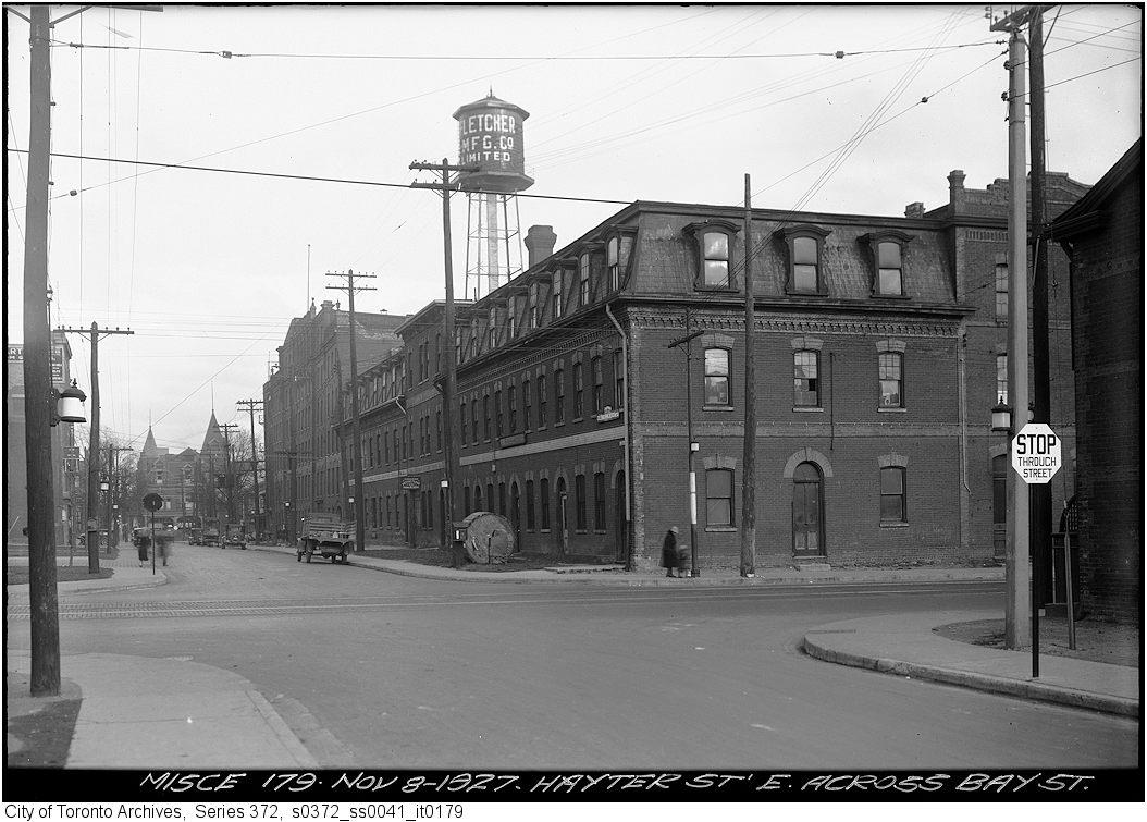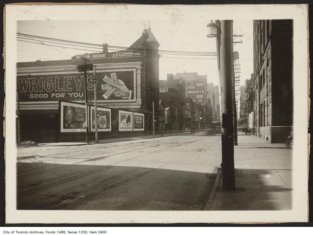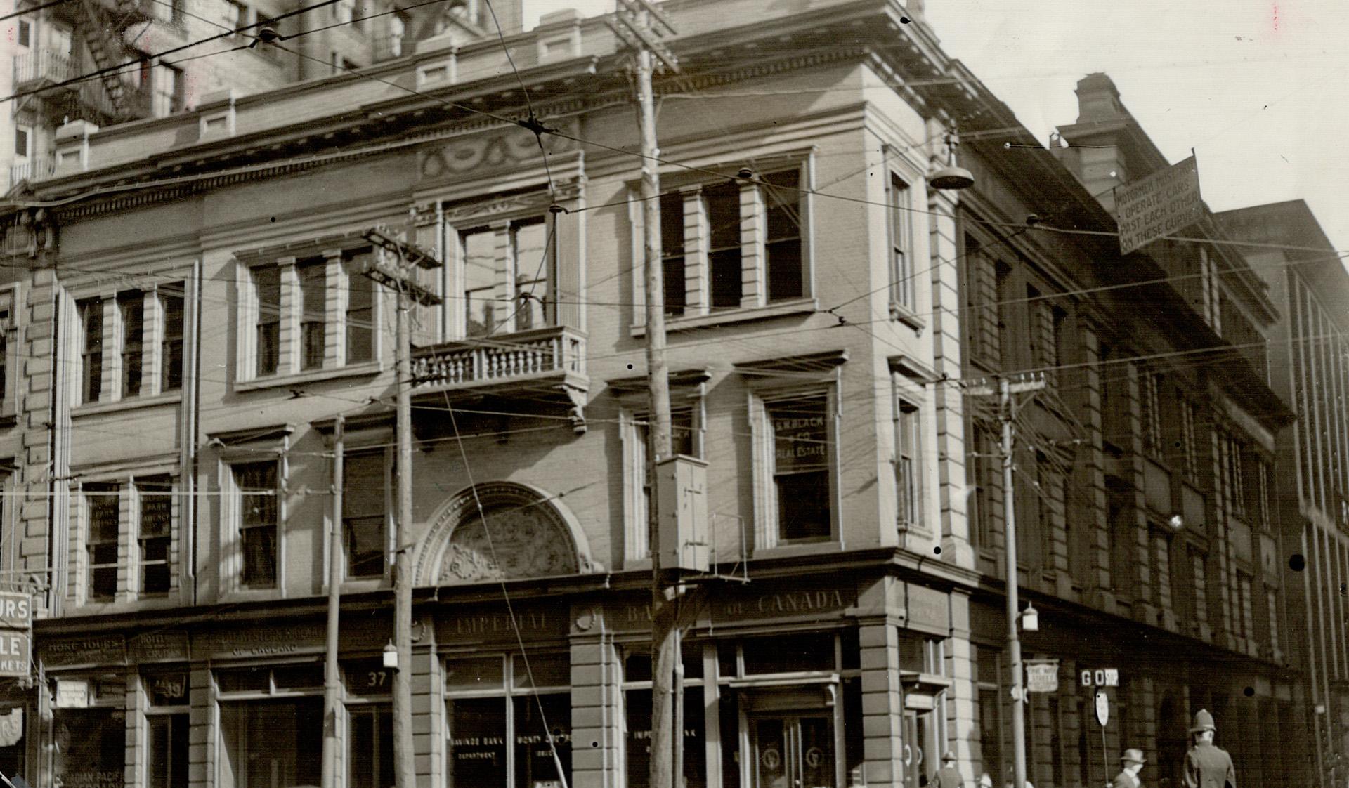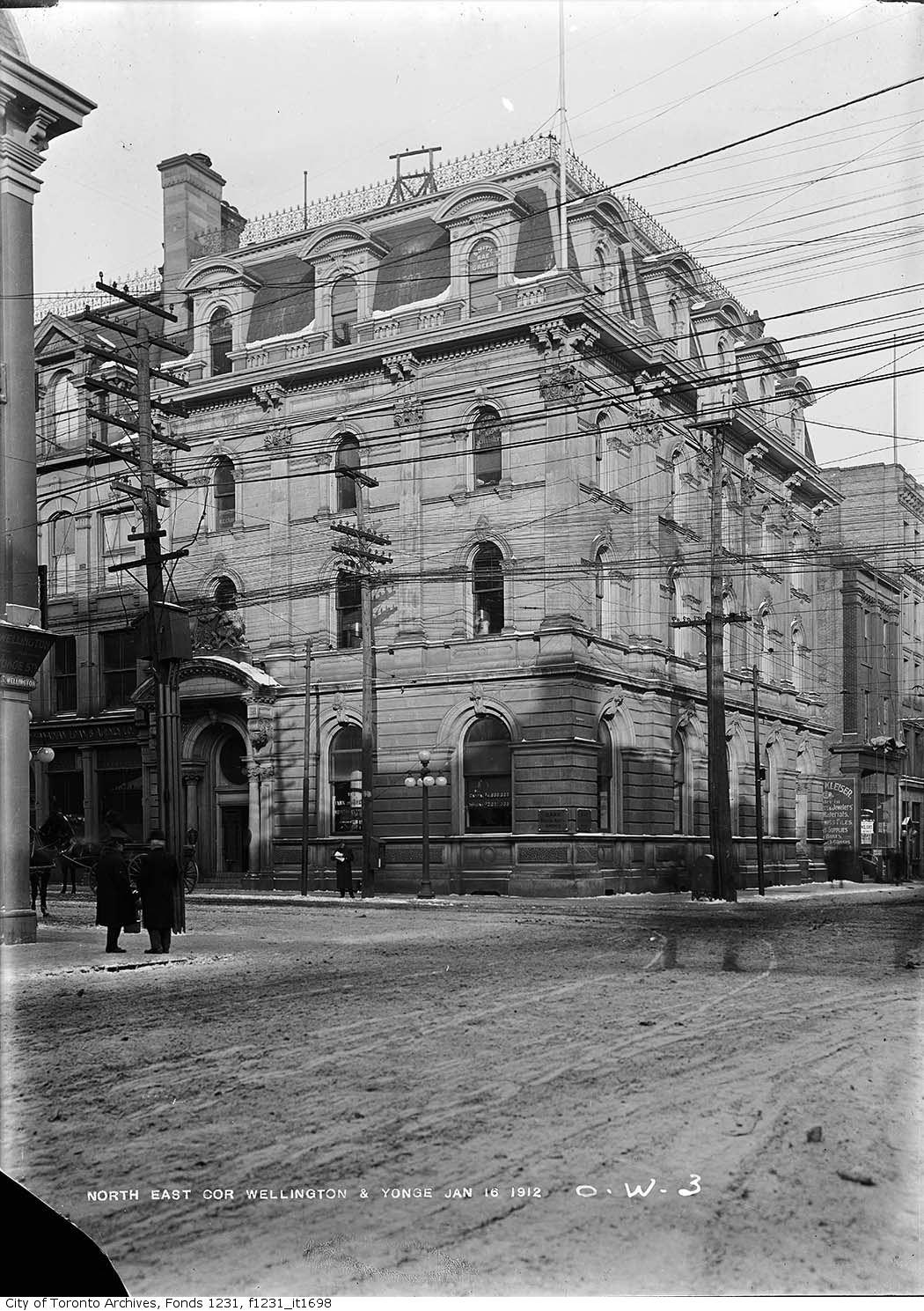 In 1827, this was the front lawn entrance of Court House Square - where the town's court house β and jail β were located. In 1840, the Wellington Buildings were erected, and the South-facing entrances to the court square buildings were moved East/West accordingly. Buildings along the commercial block were modified numerous times throughout their history, and finally the entire row was demolished around 1957. The former site is now host to the 1 Toronto office building and King Plaza condominium tower.