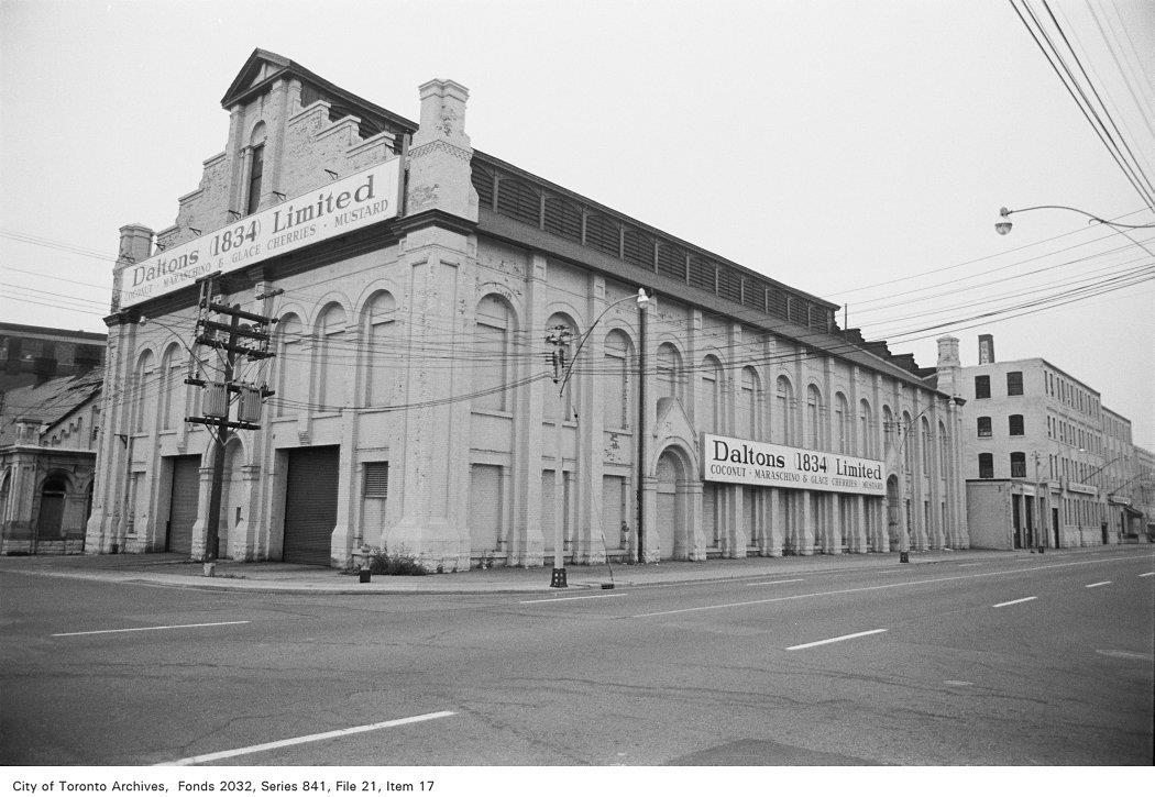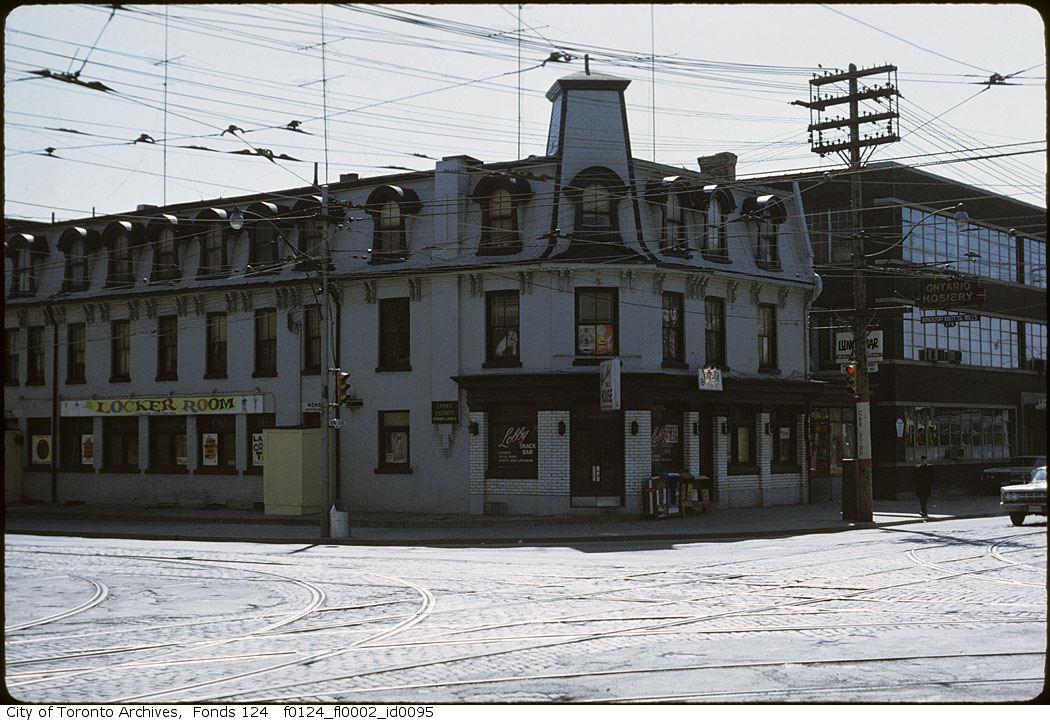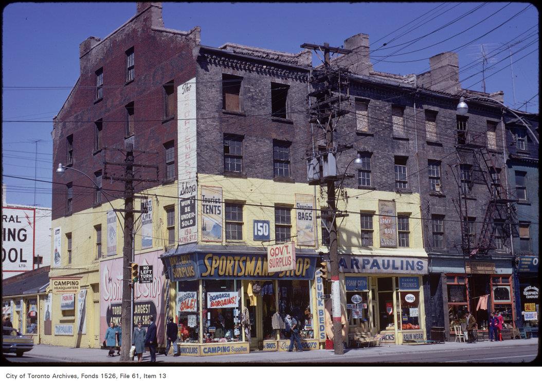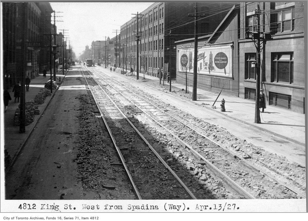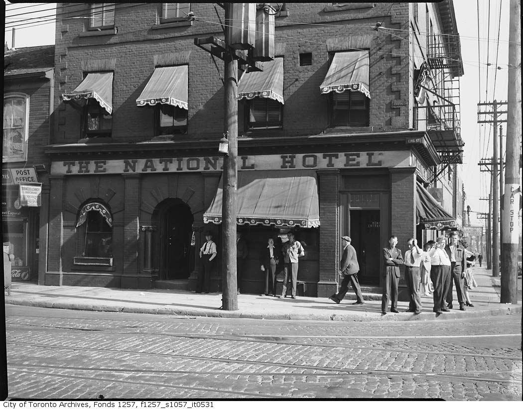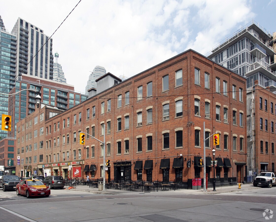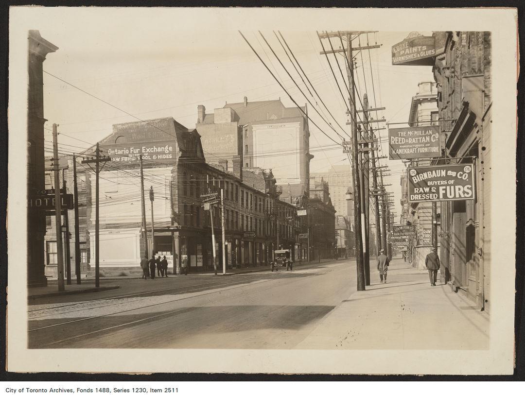 In 1827, this was the front lawn entrance of Court House Square - where the town's court house β and jail β were located. In 1840, the Wellington Buildings were erected, and the South-facing entrances to the court square buildings were moved East/West accordingly. Buildings along the commercial block were modified numerous times throughout their history, and finally the entire row was demolished around 1957. The former site is now host to the 1 Toronto office building and King Plaza condominium tower.