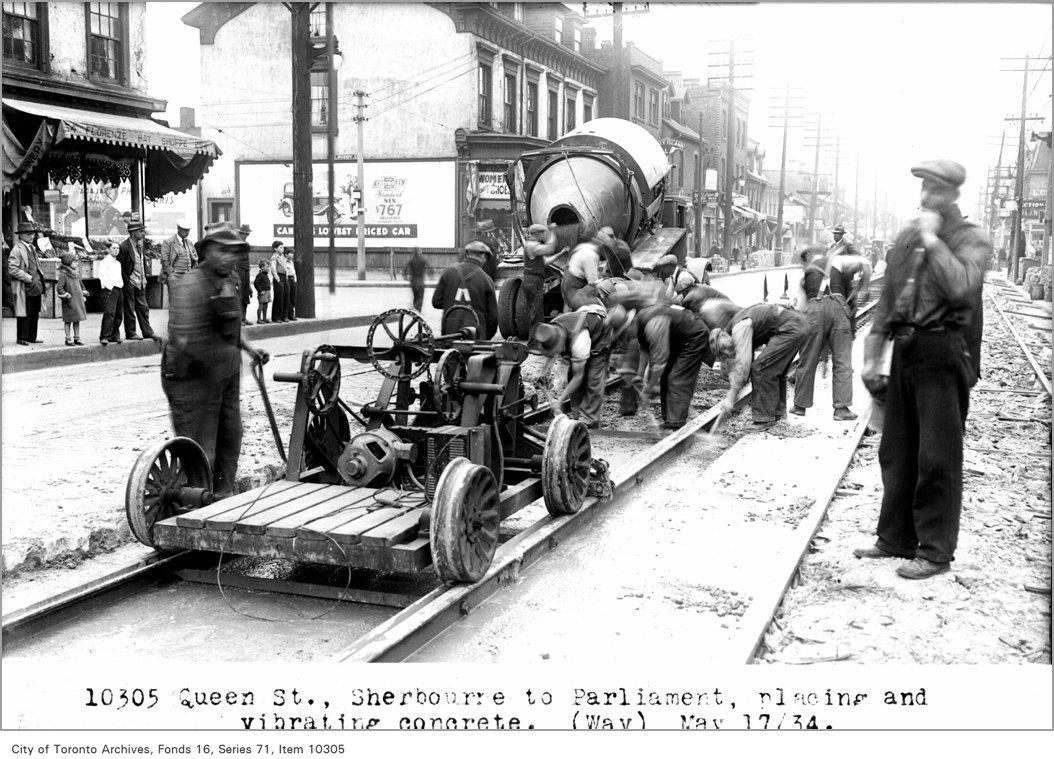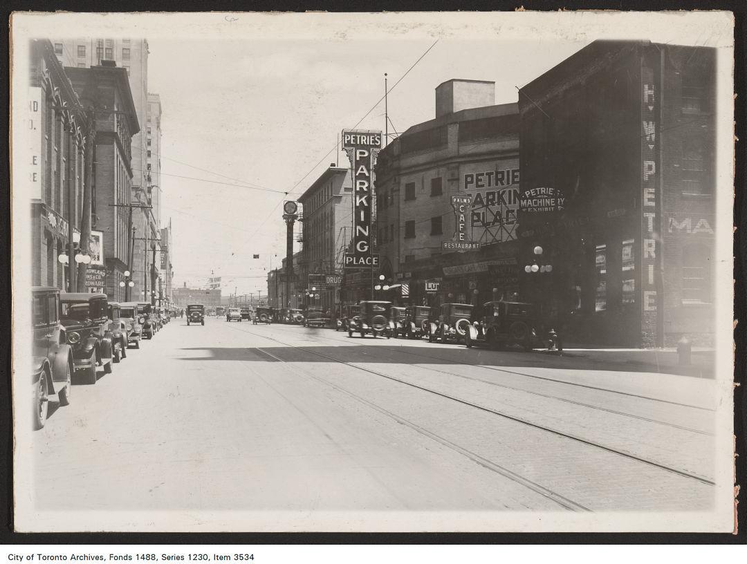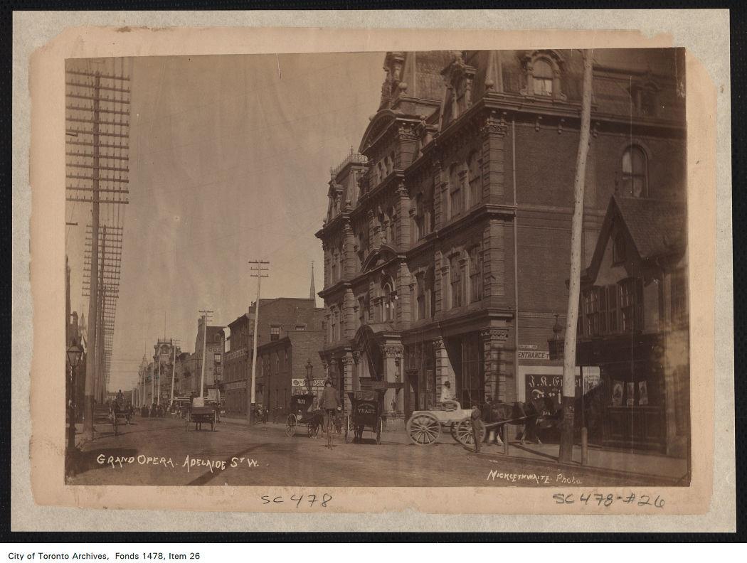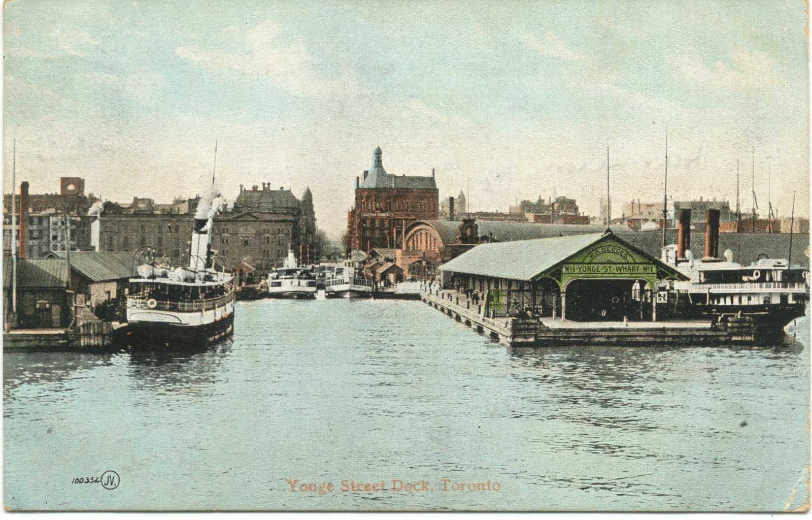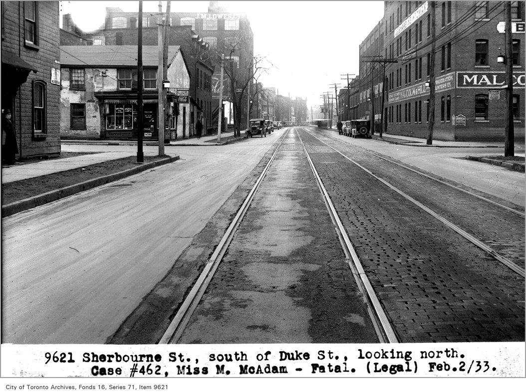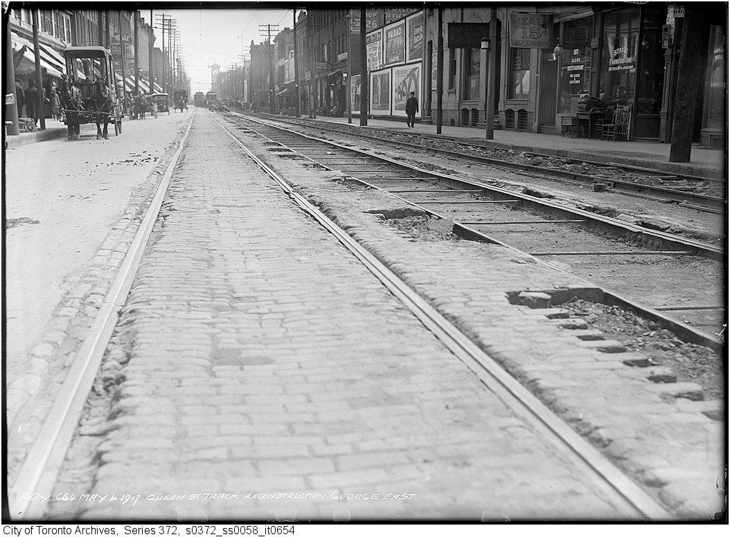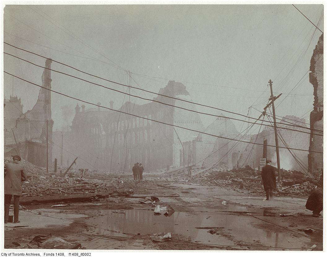 In 1827, this was the front lawn entrance of Court House Square - where the town's court house β and jail β were located. In 1840, the Wellington Buildings were erected, and the South-facing entrances to the court square buildings were moved East/West accordingly. Buildings along the commercial block were modified numerous times throughout their history, and finally the entire row was demolished around 1957. The former site is now host to the 1 Toronto office building and King Plaza condominium tower.