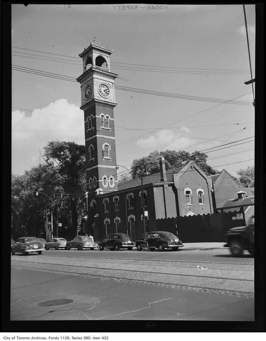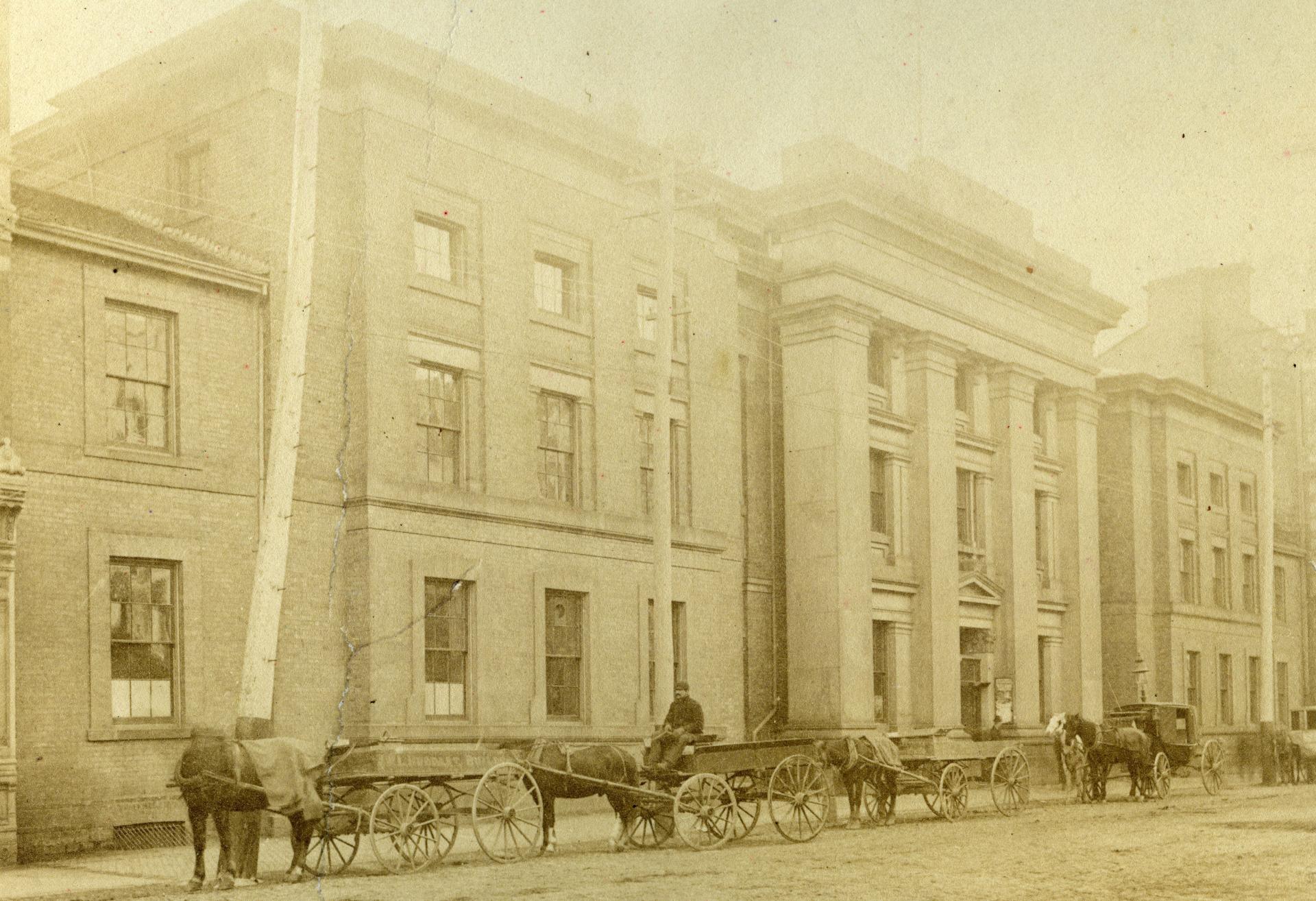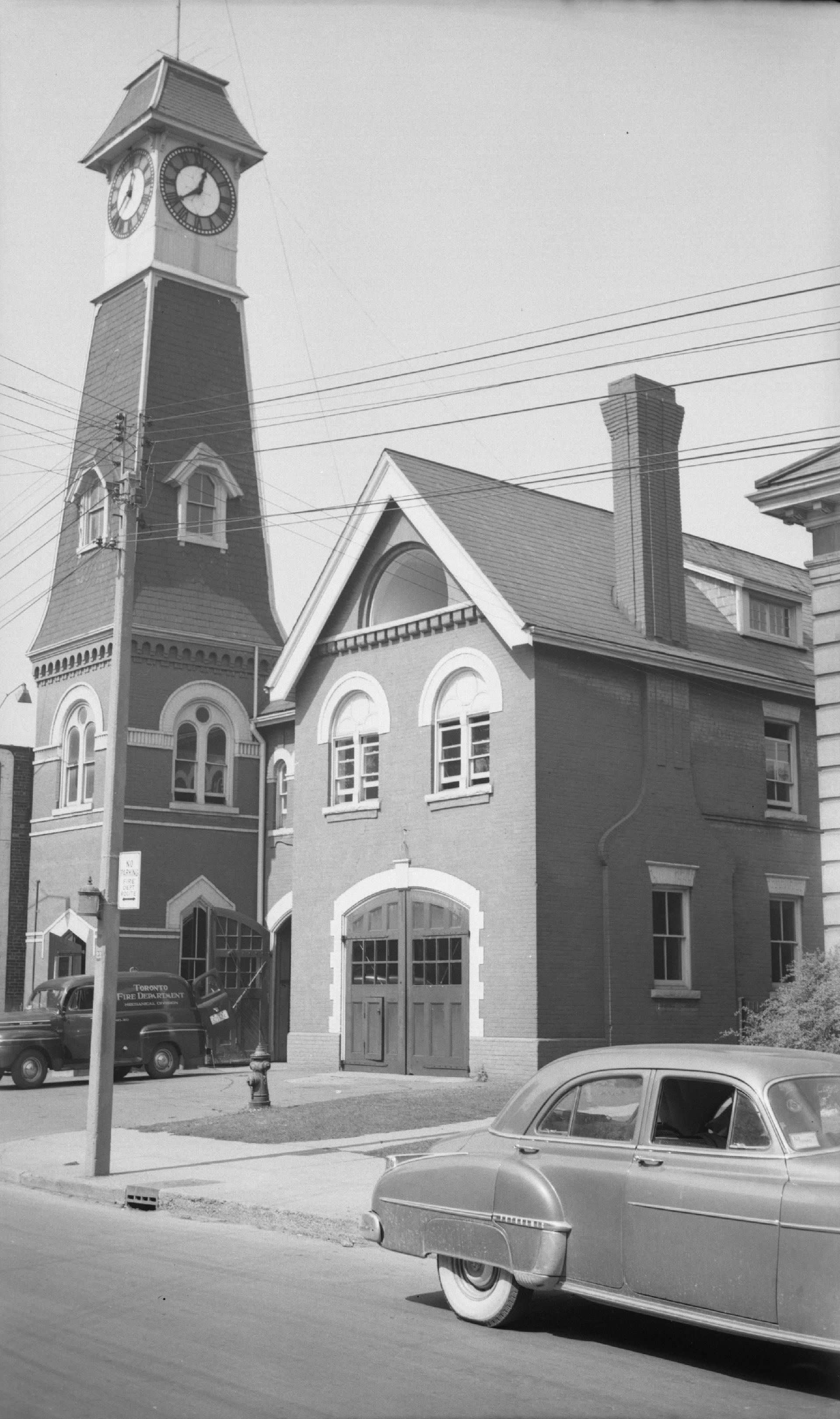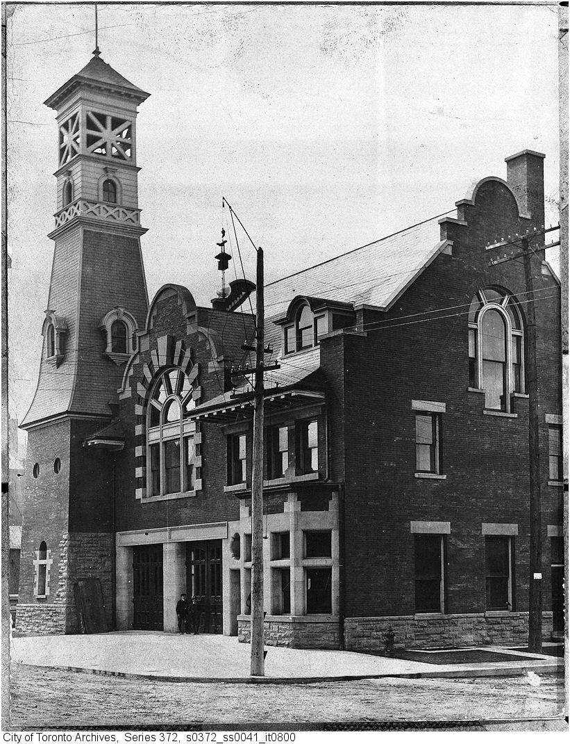 In 1846, a fire station was built at this location. The station was replaced by the Police Court building, opened 1876. The Police Court was Toronto's police headquarters, and also the No 1 Police Station. Toronto's police headquarters was previously at New Market House β.