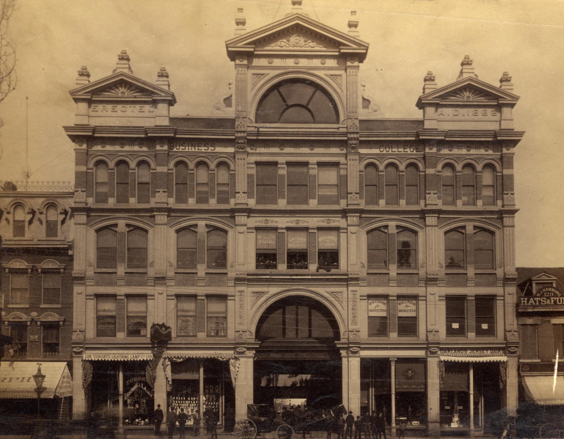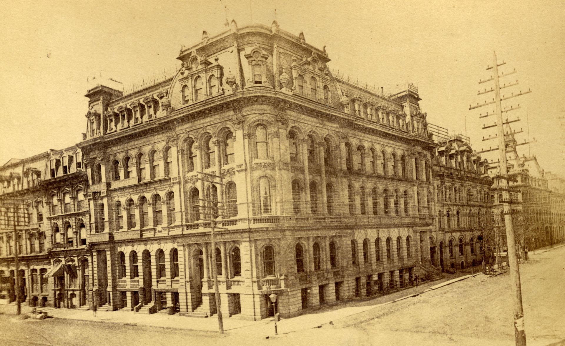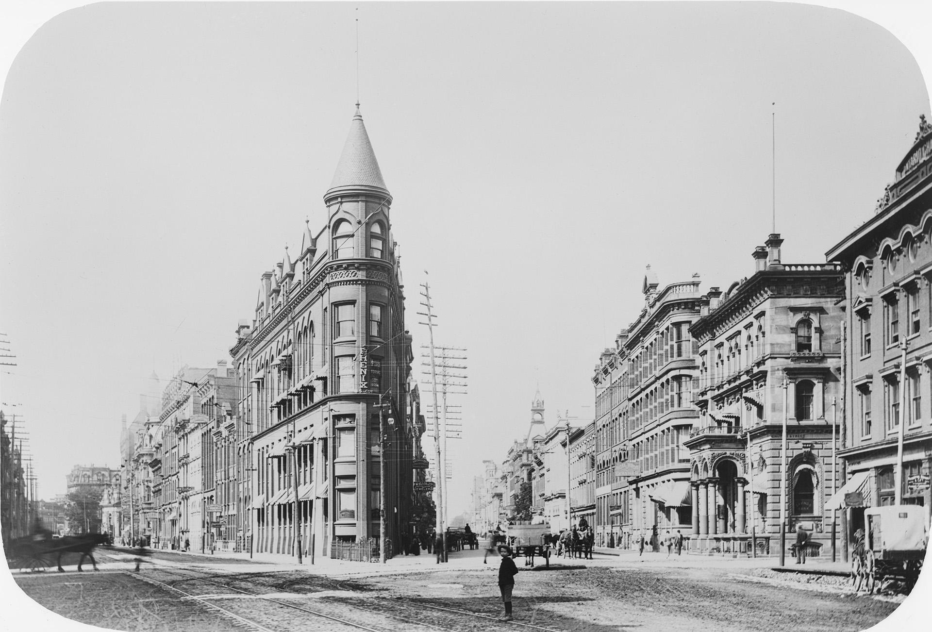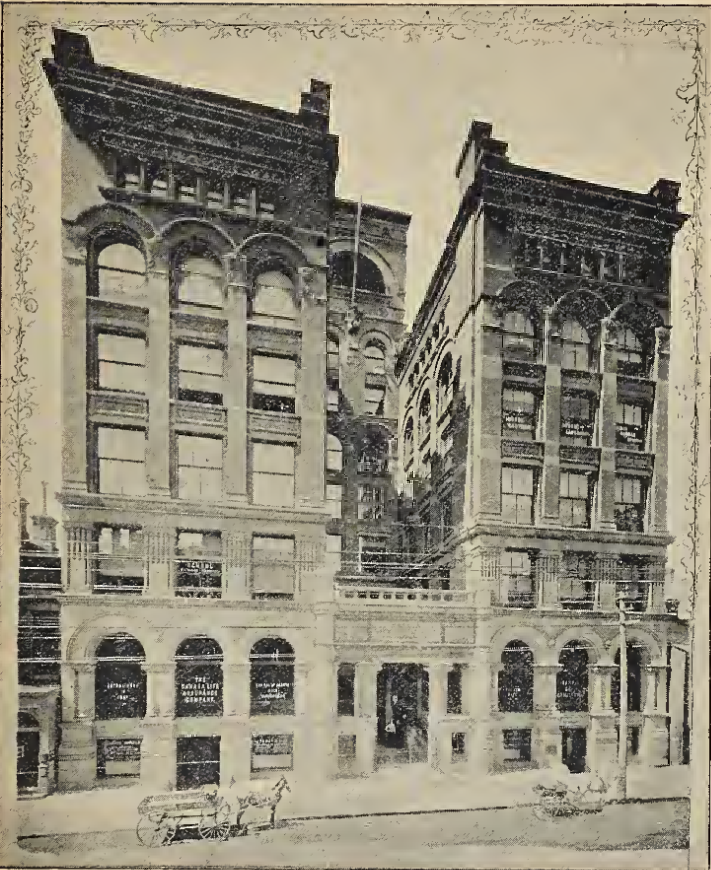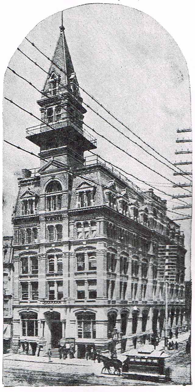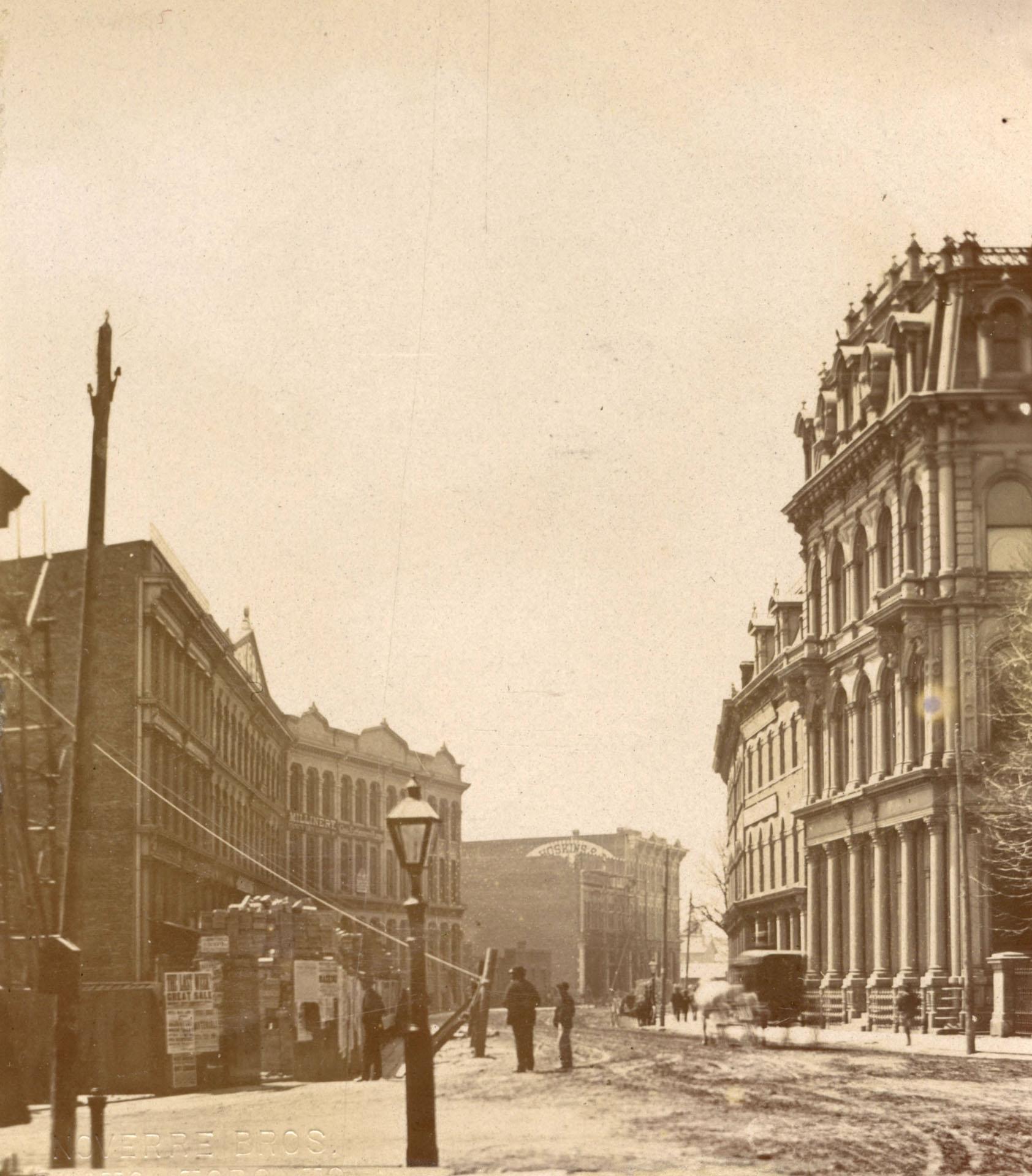 The Beard Building was a 7-storey skyscraper designed to host a bank and hotel. Unfortunately, the lot was too narrow to be practical for such a tall building, and the hotel never materialized. The building was included on this map ahead of its opening in 1895, but its height is not exaggerated like other skyscrapers on the map - it barely seems taller than its neighbours, though it surely towered over them!