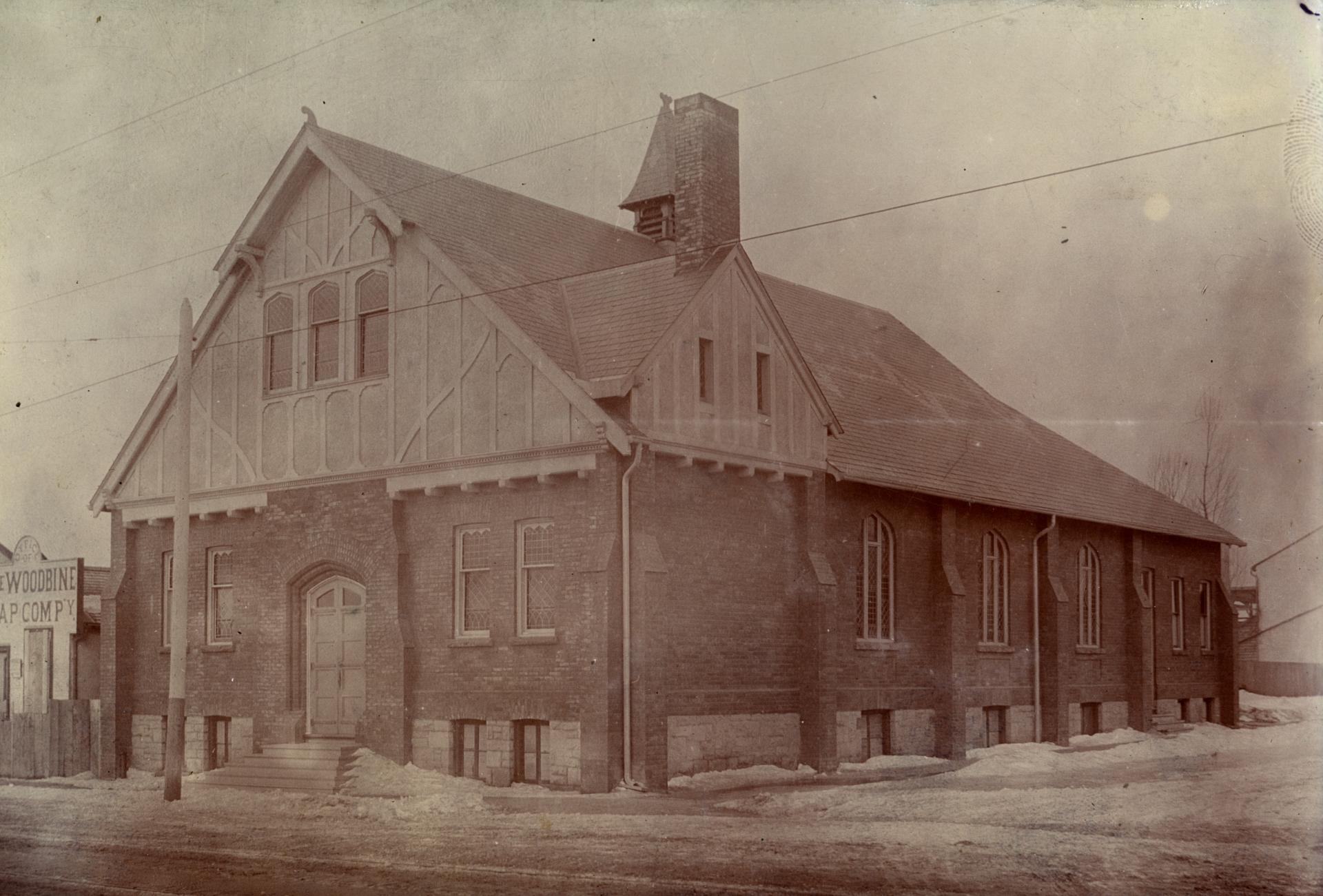 This drill shed opened in 1877. It replaced a former shed on Simcoe Street, and was used for military training.