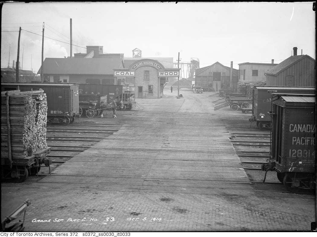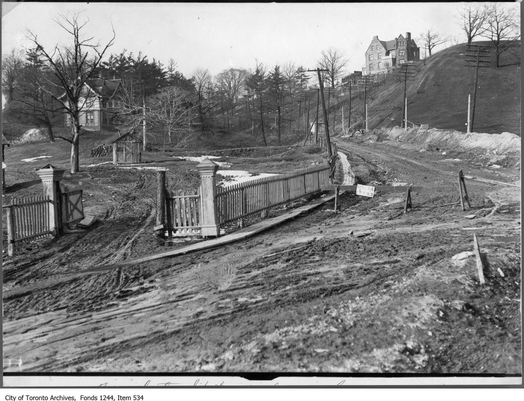 Near the end of the last ice age, around 12,000 years ago, Lake Ontario β was a much larger body of water called Lake Iroquois. Its former shoreline is today the Spadina Escarpment, also known as Davenport Hill. An old indigenous portage trail followed the shoreline, where Davenport Road is today. By the time of this map, the escarpment was a popular home for Toronto's richest residents. Several prominent mansions, including Spadina House β, Glen Edyth β, and Casa Loma, were built here.