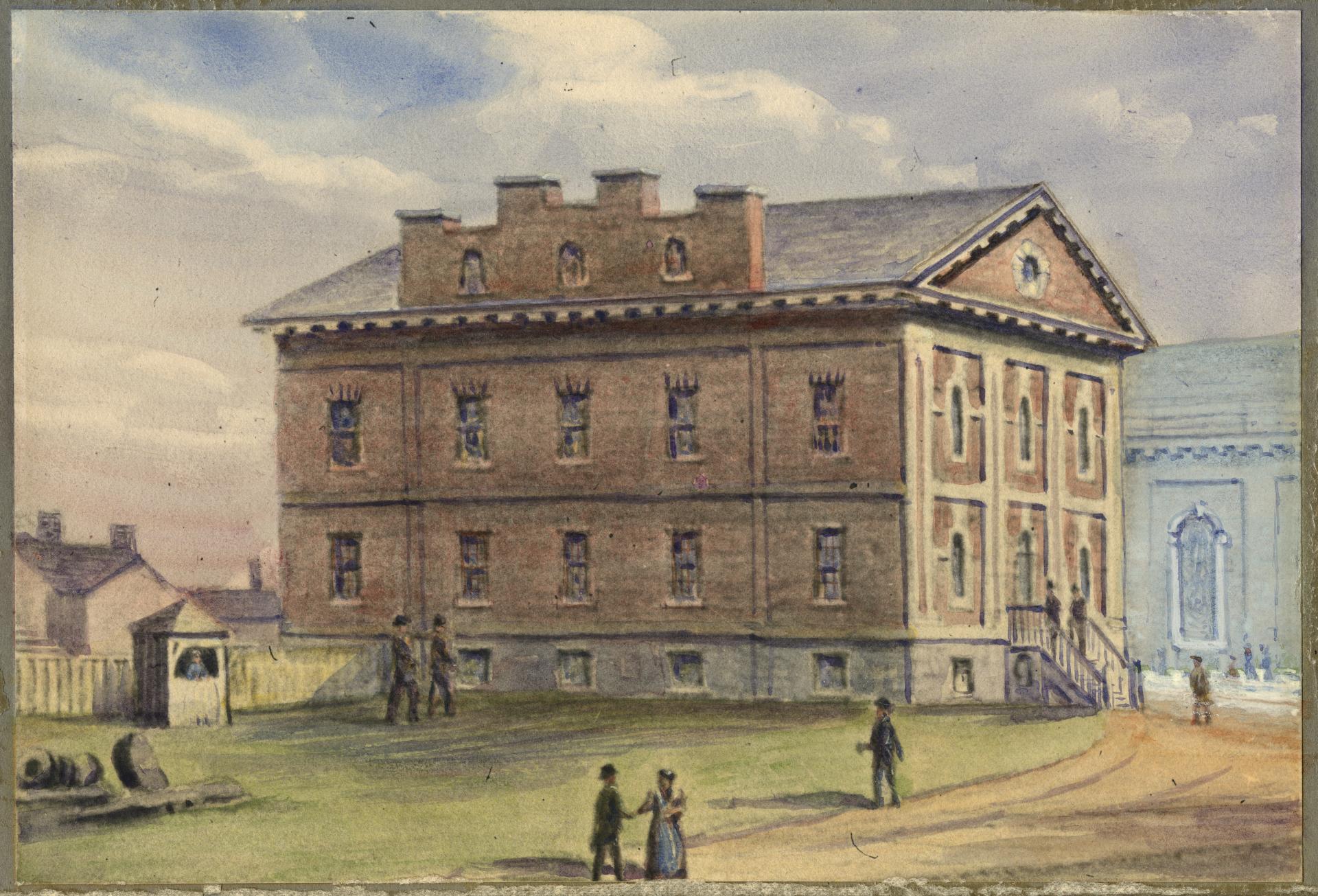 The jail closed in 1840, when the city's 3rd jail opened on the First Parliament site β. The same year, the Wellington Buildings β were built on King Street, forcing the jail's entrance to be moved to its West side, facing Toronto Street. The structure was subsequently expanded, to become the York Chambers building, as shown in the photo. This office building stood until 1957, when it was demolished. The site is now occupied by the 1 Toronto Street office building.