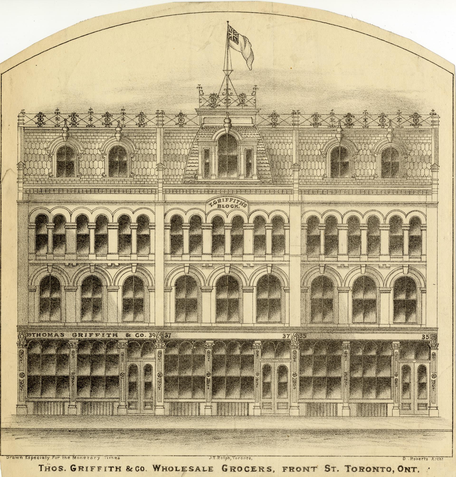 Griffith's Block was made up of 3 adjacent warehouses originally built for the Thomas Griffith and Company wholesale grocers in 1872. George Beardmore later came to own the building. Beardmore ran a large tannery in Acton, and had a warehouse in Toronto. Around 1882, his business, Beardmore & Company leather wholesalers, moved in to what became known as the Beardmore Building. Beardmore manufactured and sold leather goods such as shoes and belts.