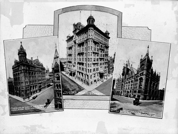 E. J. Lennox is today considered Toronto's most important architect. His portfolio included several record-breaking Toronto sky scrapers: Old City Hall β, the Beard Building β, and the Temple Building β. He went on to build the King Edward Hotel, Bank of Toronto, and Casa Loma. Other examples on this map include Standard Woollen Mills β, Victoria Hall β, Medical Council Chambers β, the Freehold Loan Building β, Stewart Building β, and Massey-Harris Head Office β. Lennox also built several churches on this map, such as the Bloor Street Baptist Church β, Broadway Methodist Tabernacle β, Bond Street Congregational Church β, and Broadview Avenue Congregational Church β.