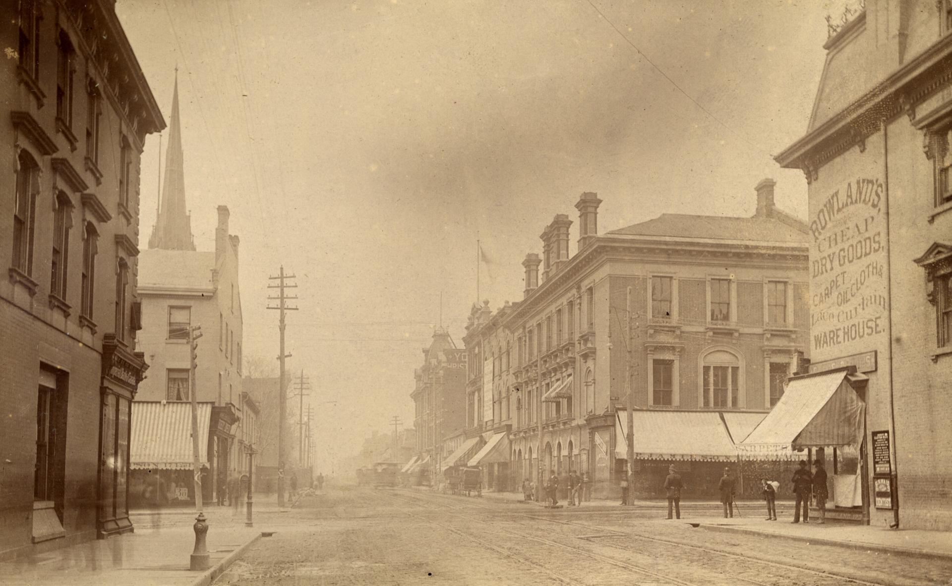 The Beard Building was a 7-storey skyscraper designed to host a bank and hotel. Unfortunately, the lot was too narrow to be practical for such a tall building, and the hotel never materialized. The building was included on this map ahead of its opening in 1895, but its height is not exaggerated like other skyscrapers on the map - it barely seems taller than its neighbours, though it surely towered over them!